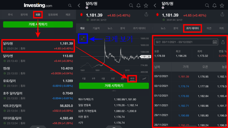 ▲ 인베스팅 닷컴 앱을 다운로드 한 다음 [시장] - [외환] - [달러] 에 들어가서 차트를 [최대] 로 보게 되면 1981년부터의 차트를 볼수 있게 됩니다. 확대 버튼을 누르게 되면 차트를 크게 볼수도 있습니다.