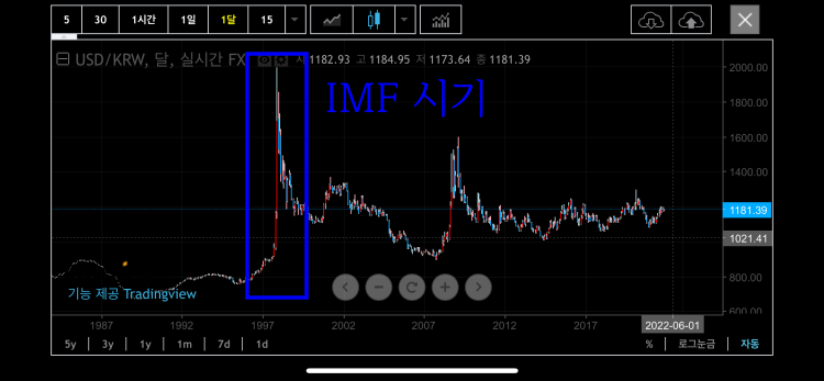 ▲ 차트를 확대해서 월봉으로 보았습니다. IMF 시기에 얼마나 환율이 올랐는지 알수 있습니다. 우리나라에 위기가 온다면 다시 이런 차트가 만들어질수도 있겠죠. 지금 터키의 환율이 우리나라의 IMF 시기와 비슷하게 엄청나게 올라가고 있죠.