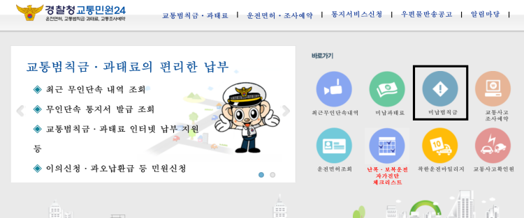 위의 페이지에 들어가면 메인화면에 미납 과태료, 미납 범칙금 항목이 있습니다. 이곳에 들어가서 공인인증서 로그인 하시면 확인이 가능합니다.
