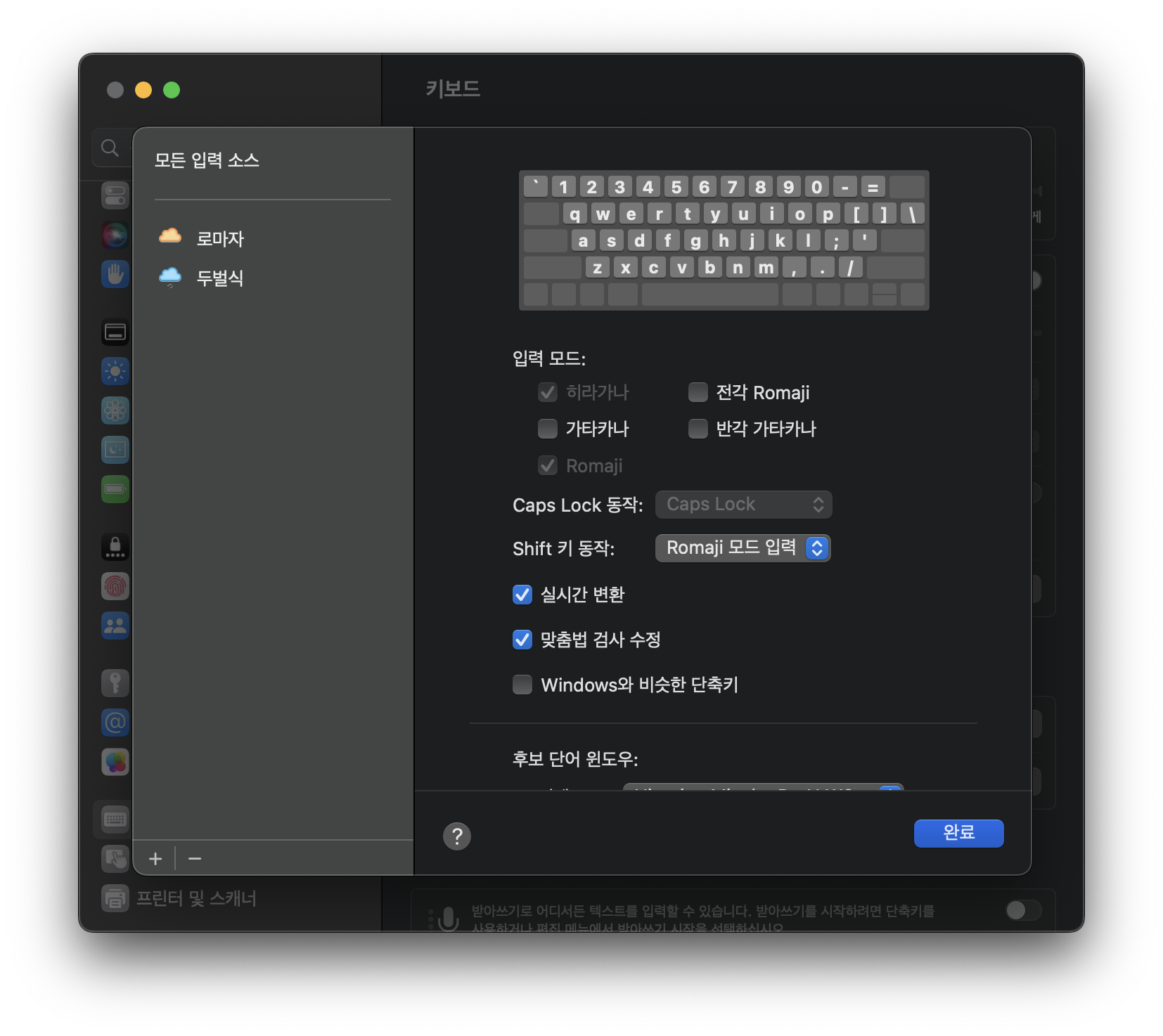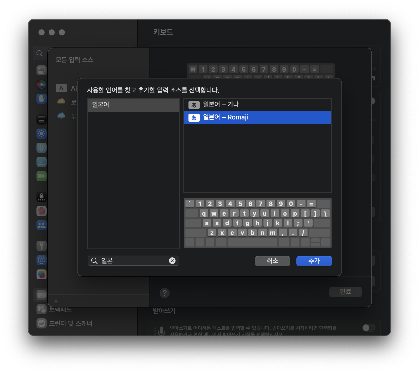 2. 모든 입력 소스에서 +를 눌러서 일본어 - Romaji 를 추가합니다. 다른 언어는 안되고 해당 언어여야합니다.