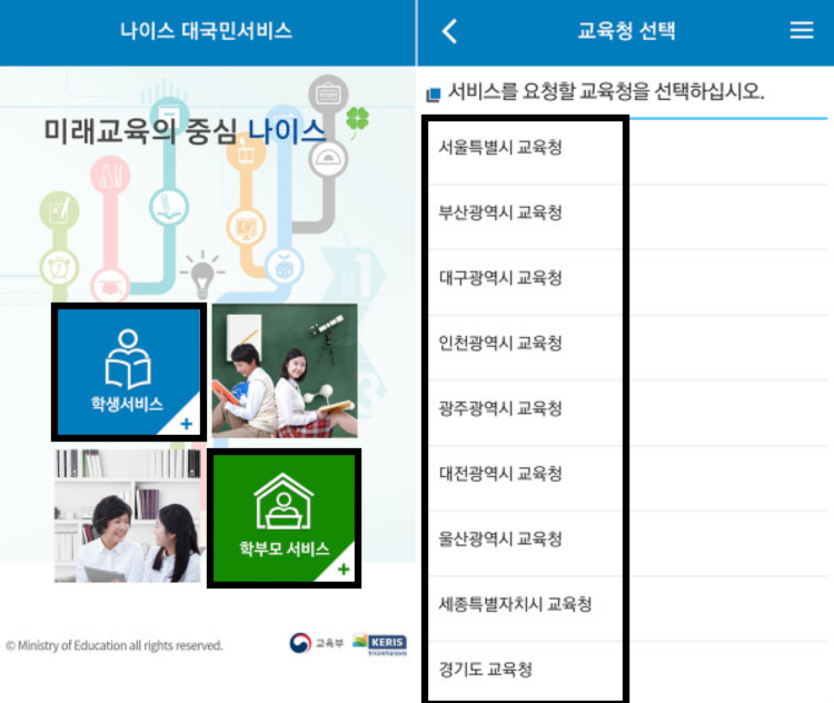 1. 앱스토어와 플레이스토어에서 나이스 대국민 앱을 설치합니다. 앱실행 > 해당 교육청 선택 > 로그인 합니다.