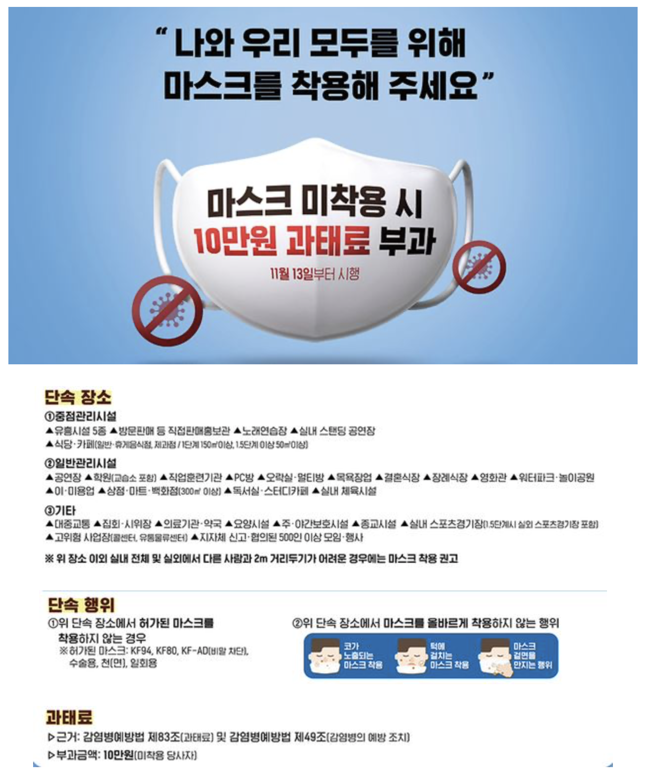 마스크는 실내 전체에서 꼭 착용해야합니다. 밖에서는 2m 이상 거리가 유지되지 않는데 마스크를 착용하지 않는 경우에 10만원의 과태료가 부과 됩니다.