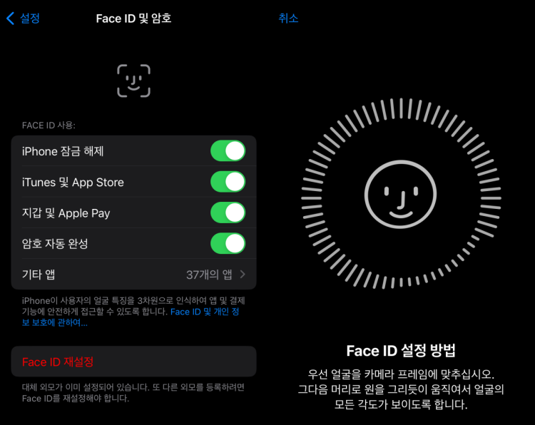 페이스 아이디 설정 자체의 문제가 있을수도 있으니 페이스 아이디를 다시 인식 시켜야 합니다.