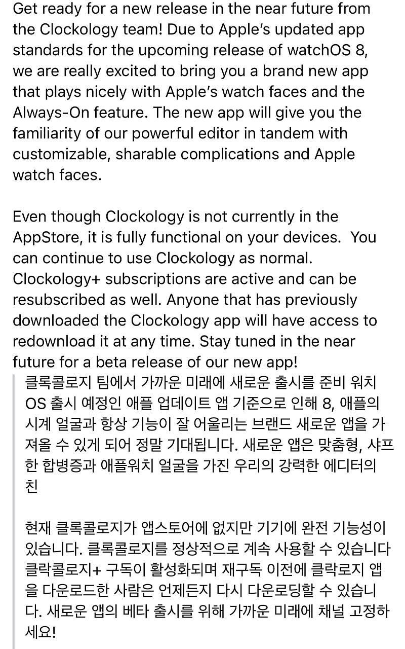 클락콜로지 팀에서 가까운 미래에 필요한 OS에 대응하기 위해서 준비중이라고 합니다. 아무래도 자체적으로 Watch OS 업데이트를 대응하기 위해서 내린 것으로 보입니다. 하지만 일반적으로 업데이트를 통해서 대응을 할텐데 방식이 조금 이상하기는 합니다.