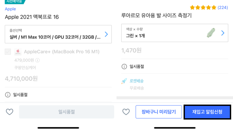 제품마다 재입고 알림 신청이 되는 것이 있고 안되는 것이 있습니다. 아마 재입고가 될 예정에 있는 상품은 재입고 알림 신청이 있고 계획이 없는 상품은 일시품절로 나오는 것 같습니다.