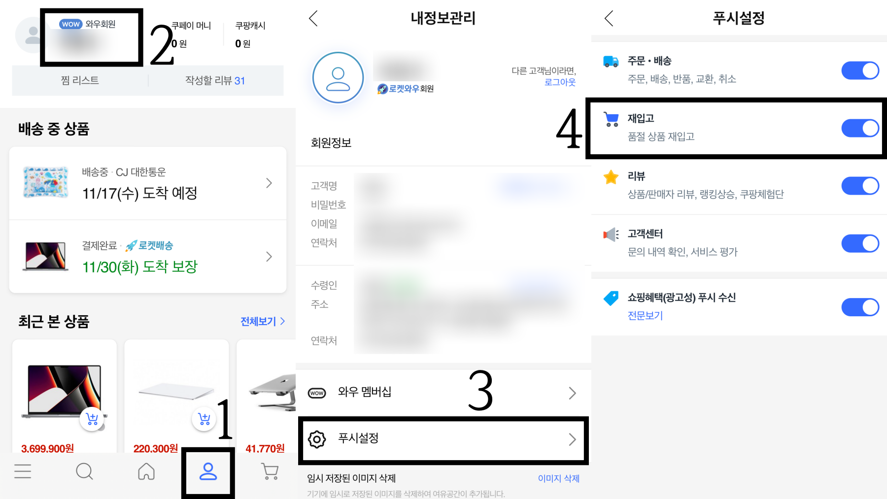 재입고 알림을 신청한 상품의 알림 취소는 할수가 없지만 재입고 알림 자체를 끌수는 있습니다. 여러개 재입고 알림을 해놓은 경우에는 어쩔수 없이 통채로 꺼야하기 때문에 불편함이 있습니다. 그러므로 많은 알림을 받고 싶지 않다면 재입고 알림 신청을 할때는 신중하게 해야합니다.
