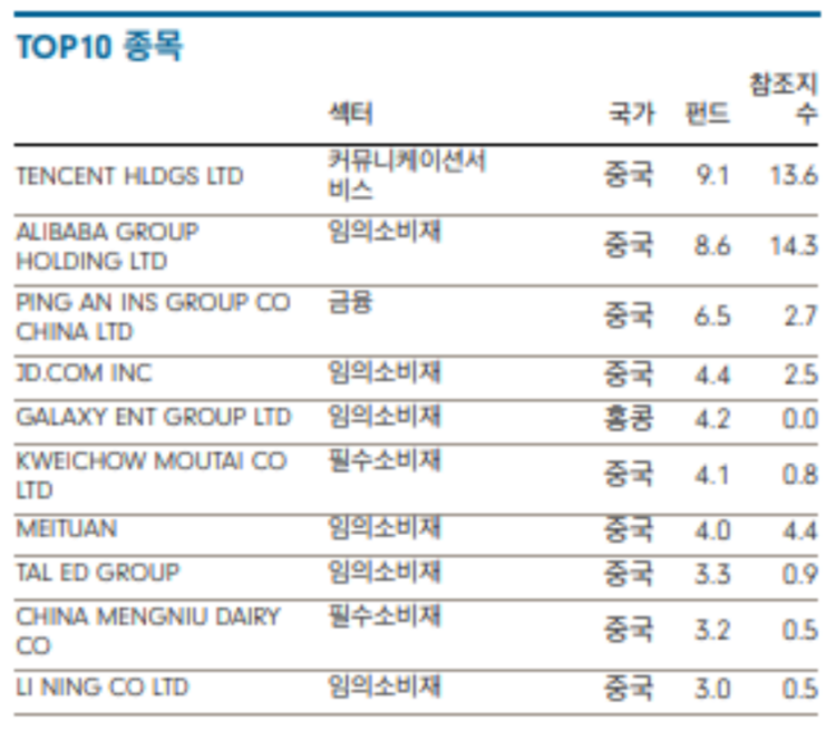 지역은 중국과 홍콩으로 구분되어 있습니다. 또한 컨슈머라는 명칭 답게 소비재 위주로 편성되어 있습니다. 알리바바, 텐센트와 같은 기업들이 포진되어 있어서 안정적으로 수익을 볼수 있을 것 같습니다.