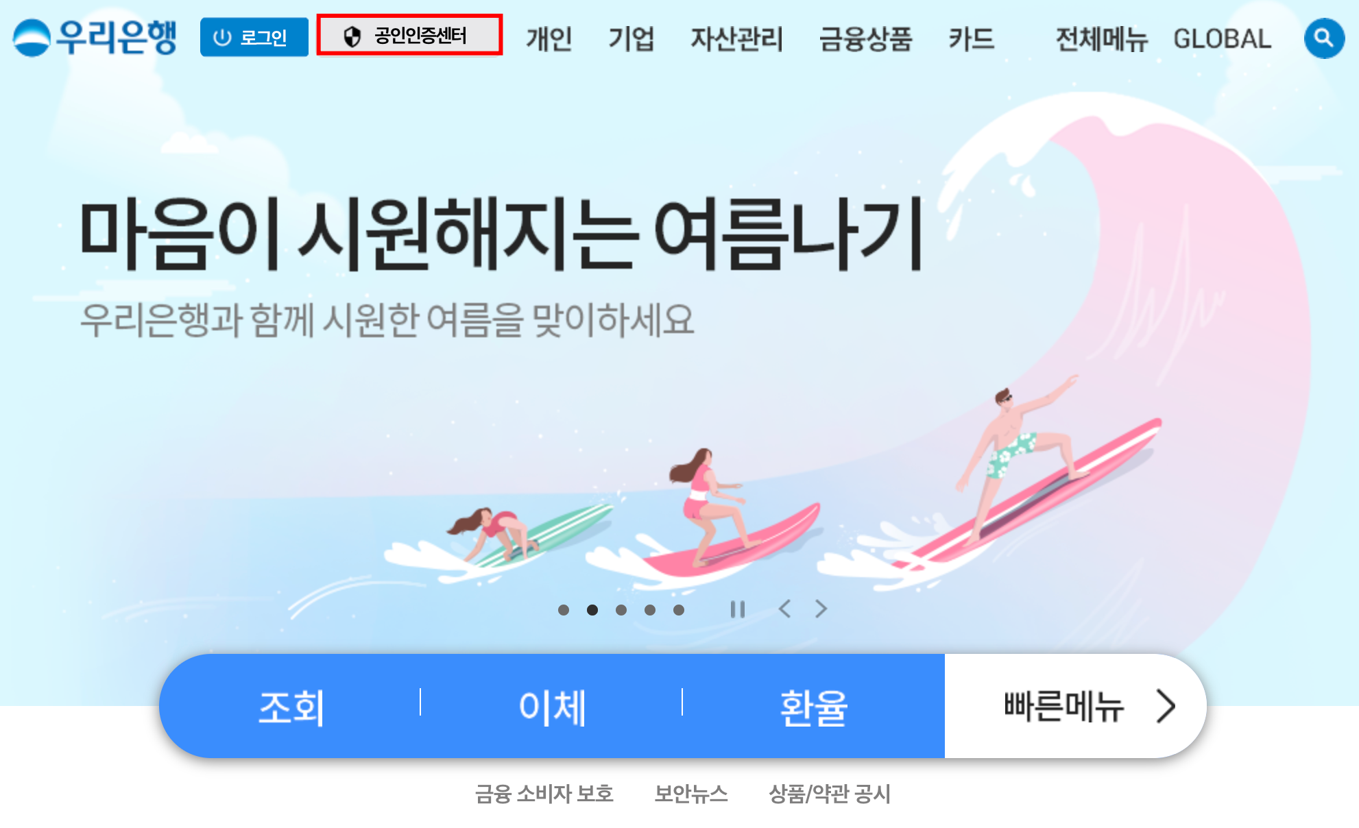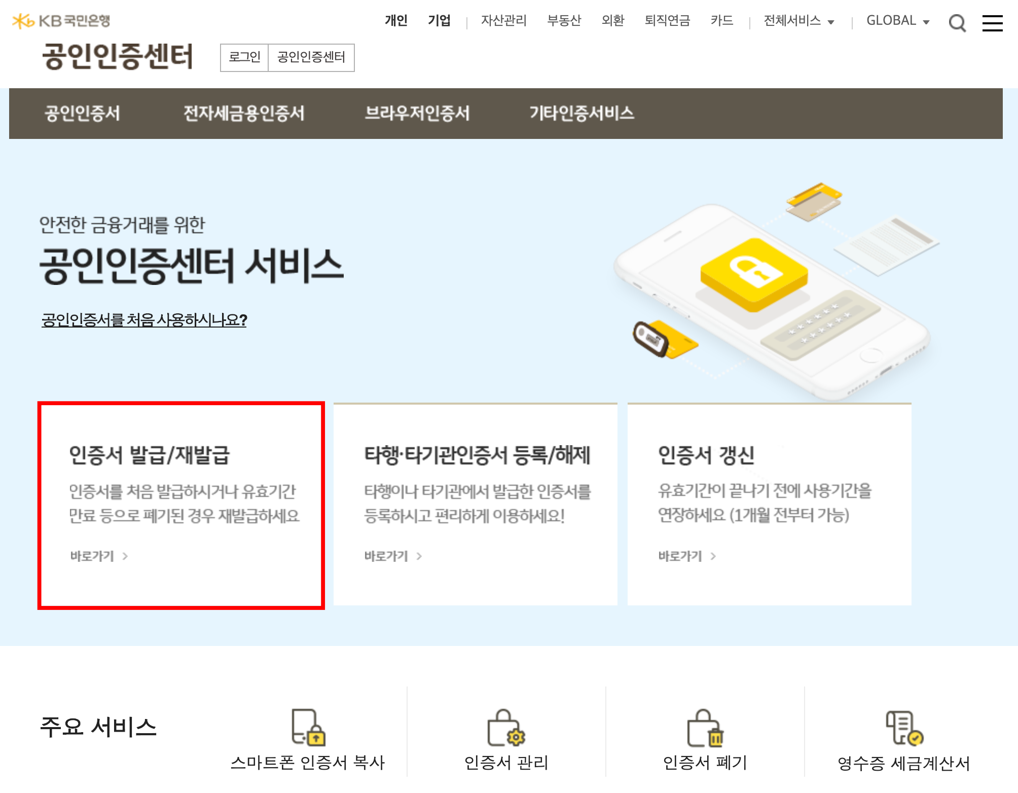 국민은행뿐만 아니라 다른 은행도 공인인증센터는 가장 잘 보이는 곳에 배치되어 있습니다. 아무리 공인인증서가 폐지되었다고 하더라도 몇 년간은 공인인증서를 사용할 수밖에 없습니다. 그래서 가장 잘 보이는 곳에 있으니까 이런 방식으로 공인인증서를 발급받아서 사용하면 되겠습니다.